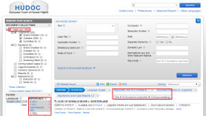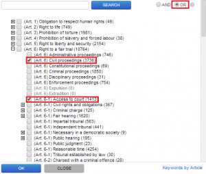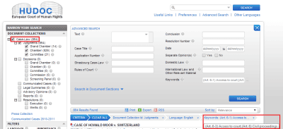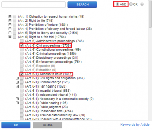 Например, если при поиске Постановлений ЕСПЧ Вы выберете ключевые термины «Гражданский процесс» и «Доступ к суду», указав, что искомые документы должны относиться к каждому из этих терминов, то получите в результате список из 864 Постановлений, которые касаются доступа к суду в рамках гражданского процесса (при условии ограничения языка Постановлений английским).
