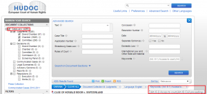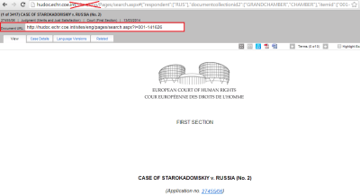 11. Постоянную ссылку на документ, размещенный в базе решений ЕСПЧ, лучше брать не из адресной строки браузера, а из поля «Document URL». Ссылка из адресной строки, если использовать ее при создании гиперссылки, многими браузерами будет обработана неправильно (она будет работать корректно лишь в том случае, если скопировать и вставить ее непосредственно в адресную строку другого браузера или другой вкладки браузера).