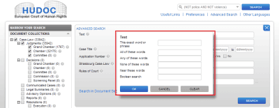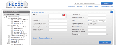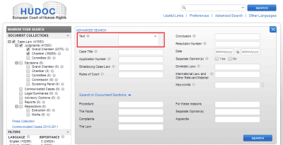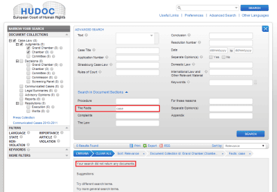 7. Несмотря на то, что база решений ЕСПЧ вроде бы позволяет осуществлять поиск по словам не только во всем документе в целом, но и в его отдельных частях (применительно к Постановлениям ЕСПЧ это вводная часть, изложение фактов, существо жалобы, применение права ЕСПЧ, его выводы и особые мнения Судей), фактически поиск в отдельных частях документов не работает. В этом легко убедиться, если попробовать найти, скажем, в изложении фактов дела какое-нибудь типичное слово, которое встречается едва ли не в каждом документе, например, слово «дело» (case). (Для этого сначала нужно раскрыть дополнительные поля поисковой формы, нажав на надпись: «Search in Document Sections».)