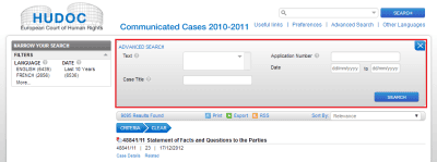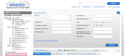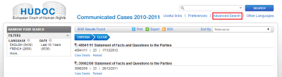2. Сведения о коммуницировании части жалоб размещены не в основной базе, а в отдельной. При этом сведения о коммуницировании других жалоб размещены в основной базе. (ЕСПЧ публикует данные о коммуницировании далеко не всех жалоб, поэтому я пишу о других, а не об остальных жалобах.) Таким образом, если Вы хотите найти информацию о коммуницировании жалобы (изложение фактов и вопросы сторонам), то необходимо сначала осуществить поиск по основной базе, а если он не дал результатов, то по дополнительной. Чтобы перейти в нее, нужно нажать на надпись «Коммуницированные жалобы за 2010—2011 годы» (Communicated Cases 2010-2011). Кстати, фактически в дополнительной базе содержится информация о жалобах, коммуницированных в 2008—2011 годах, а не в только в 2010—2011.