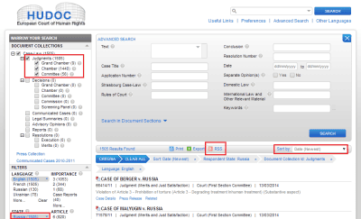 По указанной причине также стоит задуматься над тем, чтобы осуществлять раздельный поиск по Постановлениям и документам иного рода, в частности, Решениям ЕСПЧ, даже если используются те же самые параметры поиска (ключевые термины, статьи Конвенции и Протоколов к ней и т.д.).